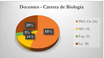 Actualmente, la Carrera de Biología cuenta con 33 docentes, de éstos 29 son docentes titulares, contratados bajo normas universitarias y con diferente asignación de carga horaria, siendo la mayoría a tiempo completo. En este grupo de docentes, se tienen profesionales con el grado de doctor en ciencias, maestría, especialidad y licenciatura. Son especialistas en diversas áreas de la biología y ecología, lo que permite organizar un conjunto de conocimientos relacionados con el avance científico y enfocado en el contexto local.