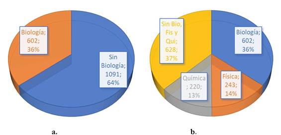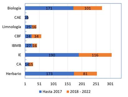 Figura 3 Aporte a la producción científica de la UMSA (a partir de datos de afiliación obtenidos en Scopus®) a. de la Carrera de Biología y b. de otras dos carreras de la FCPN.