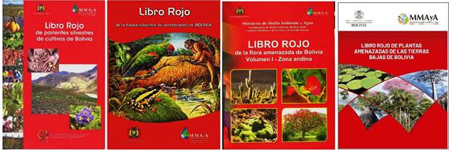 A nivel nacional, investigadores y expertos participaron en la evaluación del estado de conservación de varios grupos de la biodiversidad en Bolivia. Con el respaldo del Ministerio de Medio Ambiente y Aguas, en (2009) como parte de un proyecto internacional, se participó en la publicación del “Libro Rojo de parientes silvestres de cultivos de Bolivia”. En ese año también se publicó el “Libro rojo de vertebrados amenazados de Bolivia” con más de 135 especialistas. En 2012 salió “Libro rojo de plantas amenazadas de la zona andina” y en 2020 en el “Libro rojo de plantas amenazadas de tierras bajas”.