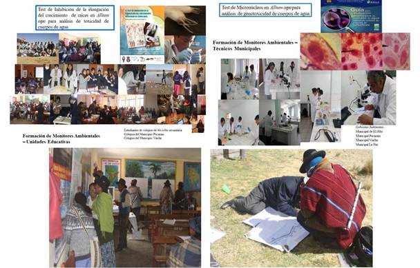 Dentro de los proyectos se han realizado actividades de interacción social, como ser talleres con las comunidades sobre la contaminación de la cuenca Katari, trabajo con los estudiantes de último año de los colegios de la Bahía Cohana, Viacha y lugares aledaños y cursos de capacitación a técnicos de las alcaldías. Algunas de las fotografías muestran estas actividades de socialización y capacitación. En el proyecto Evaluación transdiciplinaria del efecto de los metales pesados en humedales de la cuenca Katari y sus consecuencias en organismos vivos, talleres en Cohana con las comunidades y cartilla explicativa del hongo del sol de alta calidad en la comunidad Nogalani Azucarani: