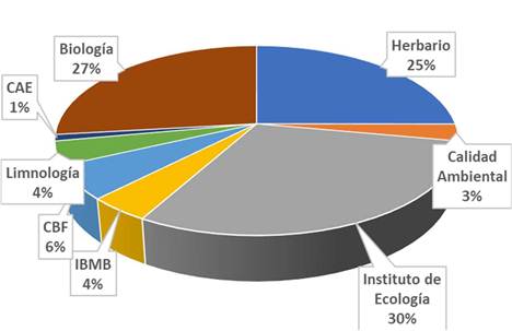 Figura 4 Proporción de menciones de la Carrera de Biología, Instituto de Ecología y varias de sus unidades de investigación, así como del Instituto de Biología Molecular y Biotecnología en afiliaciones vinculadas a las publicaciones de la UMSA (basado en datos de Scopus®). El CAE por ejemplo es una unidad que ya no funciona como tal y ha sido incluida en la Unidad de Ecología Terrestre del instituto de Ecología; la CBF y el Herbario son convenios suscritos entre la UMSA y la Academia Nacional de Ciencias.