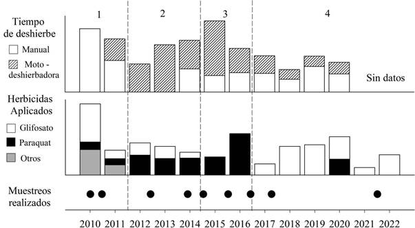 Las estrategias de deshierbe han ido variando con los años (Fig. 1). Químicamente se aplicaron glifosato y paraquat, que son los herbicidas más utilizados en la producción de cacao a nivel mundial (Azembouh et al. 2021). Se rociaron 2.671 ± 1.094 g x ha-1 x año-1 de glifosato y 1.686 ± 686 g x ha-1 x año-1 de paraquat. Mecánicamente se trabajó lo equivalente a 7.6 ± 7.2 jornadas de ocho horas anuales por hectárea de deshierbe manual y 4.5 ± 3.4 usando moto- deshierbadora. Las diferentes actividades realizadas y herbicidas aplicados fueron categorizadas en cuatro periodos distintos (Fig. 1) En el primer periodo, 2010-2011, existió mayor trabajo manual y aplicación de otros herbicidas además de glifosato y paraquat: 2.4-D (3707g x ha-1), fomesafen (280 g x ha-1) y haloxyfop (156 g x ha-1). En el segundo periodo se aplicaron ambos herbicidas (paraquat y glifosato) y los esfuerzos fueron principalmente con moto-deshierbadora al igual que en el tercer periodo, 2015-2016, en el cual únicamente se aplicó Paraquat. En el cuarto periodo, 2017 en adelante, se usó prácticamente sólo glifosato y los tiempos laborales se redujeron en gran medida, posiblemente debido a la sombra y hojarasca que genera el cacao.