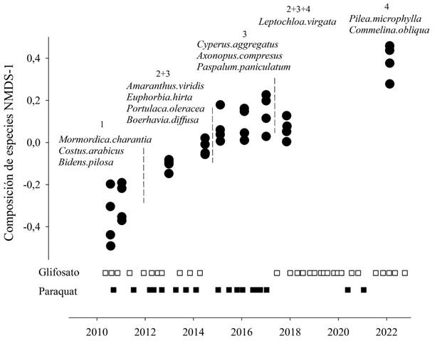 Amaranthus viridis (Amaranthaceae) se asocia al segundo y tercer periodo de este estudio. Se sabe que recientemente se han encontrado poblaciones resistentes al glifosato de esta especie en Brasil (Alcántara de la Cruz et al. 2020). Poblaciones de otra especie en este género fueron controladas con paraquat, después de haber adquirido resistencia al glifosato, el cual elimina a la planta pero no su re-emergencia (Crow et al. 2015). El patrón de abundancia de Cyperus cf. aggregatus (Cyperaceae) muestra una meseta en el tercer periodo en el cual solo se aplicó paraquat. Esto se relaciona con estudios que han encontrado que otra especie del mismo género es fácilmente controlada por glifosato, pero no por paraquat (Iqbal et al. 2012).
