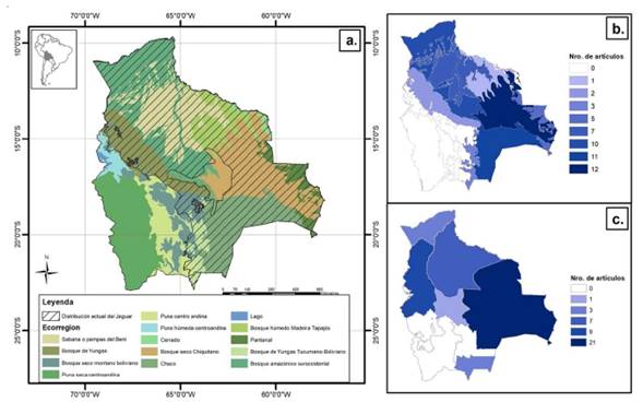 Figura 1. Distribución actual del jaguar en Bolivia (UICN 2017), a. en las ecorregiones de Bolivia (Olson et al. 2001), b. número de artículos publicados entre 2010 y 2024 por ecorregión y c. por departamento. No se incluyen los artículos que abarcaban toda el área de distribución del jaguar (n=9).