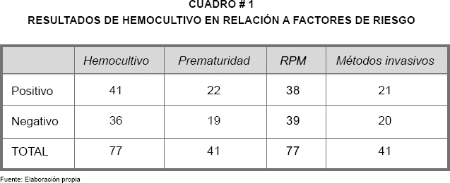 De 77 pacientes examinados, encontramos una frecuencia de 41 (53.25%) con hemocultivo positivo, de los cuales 22 (54%) fueron prematuros, y de ellos 8 (36.6%) presentaron antecedentes de meconio. El antecedente de RPM estuvo presente en 38 (49%) madres. Las mujeres sin control prenatal, cuyo producto resultó con hemocultivo positivo fue de 22 (54%). Fueron sometidos a utilización de catéter venoso periférico 21 (51.2%), catéter venoso central 20 (50%), utilizaron ventilador 21 (51,2%). Como se puede observar en el Cuadro #1.