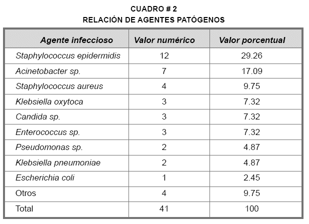 No se observó diferencia relevante en los hemocultivos de los pacientes cuyo resultado fue positivo y cuyos microorganismos aislados se detallan en el Cuadro # 2.