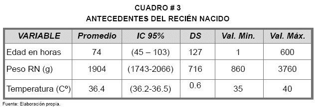 La edad promedio en este grupo de niños con hemocultivo positivo fue de 122.4 horas con un desvío estándar (DS) de 157.3, valor mínimo de 1 hora y máximo de 600 horas, a diferencia del promedio de edad en el grupo con hemocultivo negativo que mostró ser mucho mas bajo dando un valor de promedio de 18.1 horas, SD 31,1 valor mínimo de 1 y valor máximo de 168 horas de vida. En relación al peso del RN con hemocultivo positivo fue de 1869.9 g, DS 730, valor mínimo de 860 y valor máximo de 3760 g, cuyo detalle se puede observar en el Cuadro # 3.