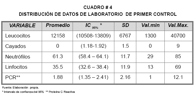 En la distribución de los datos de Laboratorio tanto de hemograma como de proteína C reactiva, están descritos en el Cuadro # 4.