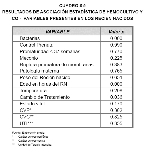 En lo que se refiere a la asociación estadística entre hemocultivo y las co variables, existe asociación estadísticamente significativa al comparar el promedio en horas del recién nacidos con el hemocultivo positivo, mostrando que a mas horas de vida existe mayor cantidad de hemocultivos positivos (p < 0.000). Otra variable que mostró asociación fue el resultado al cambio de tratamiento dando un valor p < 0.036. Cuadro # 5.