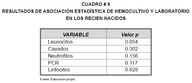 Es importante destacar los resultados obtenidos en el análisis relacionado con los datos de laboratorio y la relación con los resultados del hemocultivo, como se observa en el Cuadro # 6 no existe ninguna diferencia en los promedios de los parámetros de las células blancas diferenciales con el hemocultivo positivo o negativo, como también del recuento total de los glóbulos blancos y proteína C reactiva. Esto significa que no existe diferencia de las células blancas y proteína C reactiva en relación al resultado del hemocultivo.