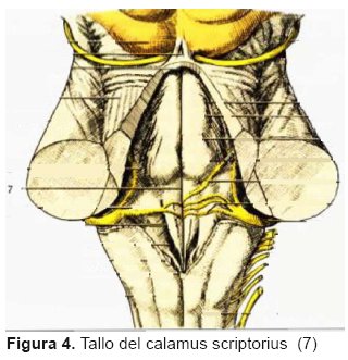 Es considerado el primer anatomista, escribió un tratado de varios volúmenes, que no se ha conservado, estudió la anatomía cerebral. El seno de ese órgano, la prensa de Herófilo, recuerda sus aportes. Descubrió las meninges, el cerebelo y describió el calamus scriptorius (surco medio y estrías acústicas del IV ventrículo [Fig. 4]). Clasifico los nervios en sensitivos y motores; y también en voluntarios e involuntarios. Dijo que la inteligencia reside en el cerebro. Aristóteles afirmaba que esa función era competencia del corazón. Diferenció los nervios de los vasos sanguíneos y ligamentos, Aristóteles no los distinguía de los tendones.11