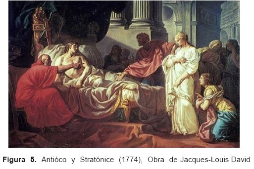 Erasístrato, para hacer ese diagnóstico, tuvo la idea de hacer desfilar delante del enfermo a todas las mujeres del palacio, mientras tenía su mano sobre él, lo puso para recoger la eventual reacción emotiva. Notó que se aceleraba el pulso de Antióco, se demudaba el rostro y se cubría de sudor, cuando pasaba Stratónice, la segunda mujer de su padre Seleuco. Erasístrato indujo a Seleuco a ceder la mujer a su hijo, que así se curó. Este episodio ha inspirado a muchos artistas, es el tema de un célebre cuadro de Jacques-Louis David (Fig. 5).