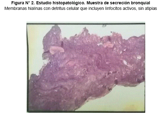 En los resultados de cultivo solicitados, se identificó por Hemocultivo a S. pyogenes, sin reporte de unidades formadoras de colonias, sensible a vancomicina. Debido a que las secreciones bronquiales eran de características asalmoneladas es que se solicitó un estudio histopatológico (Ver figura 2 y 3) el cual concluye: edema pulmonar con signos histológicos que sugieren insuficiencia cardiaca asociada.