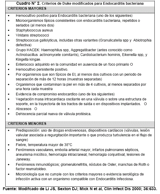 A continuación, se presenta los criterios de Duke modificados (Cuadro N° 1)10.