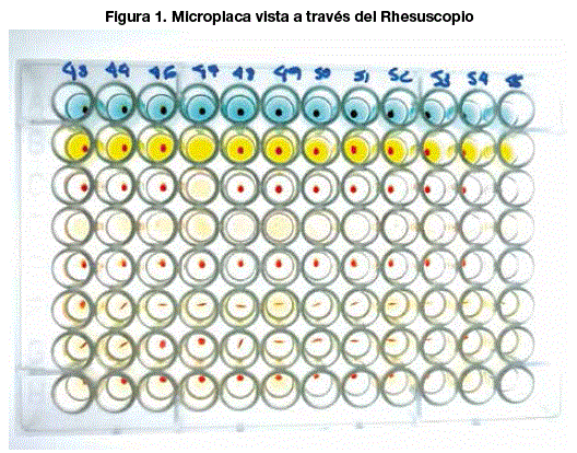 Se utilizó la técnica de microplaca, siguiendo las recomendaciones de procedimiento y control de calidad 9