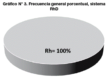Con respecto al análisis del sistema RhD, se evidenció que la frecuencia es absoluta con un 100 %, no encontrándose en este estudio fenotipos RhD negativo ni fracciones variantes ni parciales.
