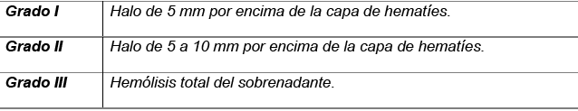 Este grado se midió cuando los frascos de paneles de eritrocitos eran sacados del refrigerador y antes de mezclarlos para las posteriores mediciones. Si se apreciaba un halo de hemolisis por encima de la capa de eritrocitos.