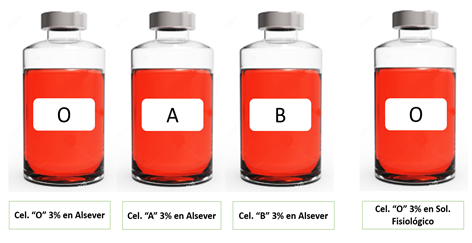 Se evaluó la supervivencia de los eritrocitos en dos grupos, uno conservado en solución Alsever modificada y otro en solución fisiológica, estos paneles se prepararon a una concentración del 3% en solución Alsever de los grupos sanguíneos A, B y O para su posterior evaluación.