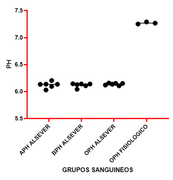 Figura 2 Evaluación del PH de la preparación de eritrocitos en solución ALSEVER y en solución fisiológica de los grupos sanguíneos A, B, O Y O FIS.