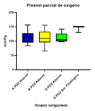 Figura 3 Evaluación de la presión de oxígeno de la solución ALSEVER y solución fisiológica de los grupos sanguíneos