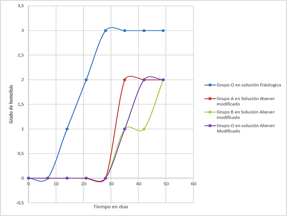 Los resultados de esta investigación mostraron que la solución Alsever modificada conserva los eritrocitos por hasta 42 días en comparación a la solución fisiológica que conserva solo 7 días.