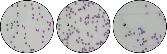 Figura 5 Eritrocitos del grupo sanguíneo "A" en solución alsever en la primer, tercera y sexta semana de evaluación.