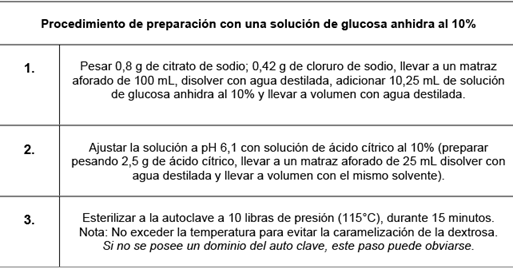 Tabla 1 Solución Alsever preparada en el Instituto Seladis en tres pH diferentes para su evaluación, tamponados con ácido cítrico.