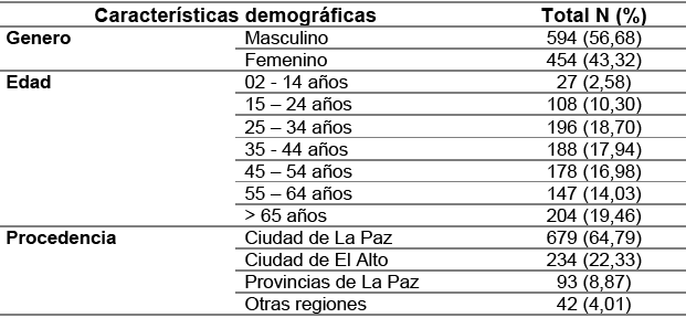 Análisis estadístico descriptivo Se realizó un análisis estadístico descriptivo de 1,048 resultados de pacientes cuyas muestras biológicas fueron remitidas al Laboratorio de Genética Molecular del Instituto SELADIS para el diagnóstico molecular TBEP mediante qPCR durante el periodo 2019-2023. El perfil demográfico de los pacientes se presenta en la Tabla 1.