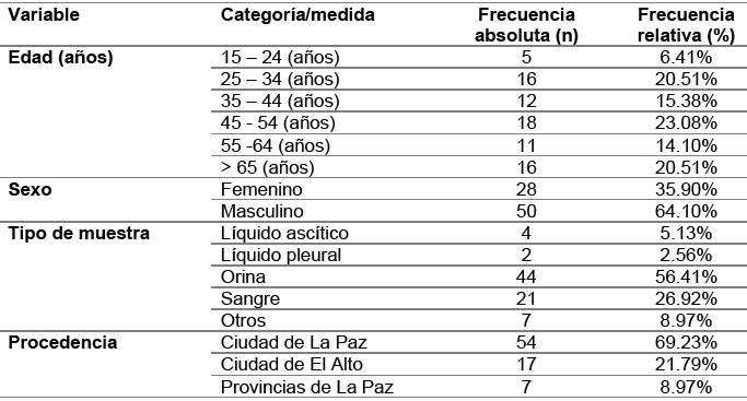 Los datos recopilados para cada paciente incluyeron variables demográficas (edad y sexo), tipo de muestra biológica obtenida, y procedencia geográfica. Estas variables fueron extraídas de los registros clínicos y las bases de datos del laboratorio, garantizando la confidencialidad y anonimización de la información.