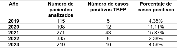 Durante el período 2019-2023, la frecuencia de TBEP fue del 7.44% en los pacientes sospechosos que acudieron al Laboratorio de Genética Molecular del Instituto SELADIS.