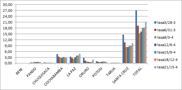 En la figura 1, se describe las diferentes tasas promedio analizadas en el período antes descrito. Para su mejor comprensión, se asumirá que el eje de “y”, también está representado en una escala de km/hora (velocidad de propagación). Al multiplicar por 10 cada uno de los valores de casos nuevos del eje “y”; por ejemplo el total en Bolivia en la variable tasa21/15-4, su valor 21.0 se lo comprendería también como una velocidad de 210 km/hora (21 x 10= 210). Lo anterior permitirá realizar comparaciones de la “tasa promedio” de velocidad de propagación del virus entre los departamentos y el total del país.