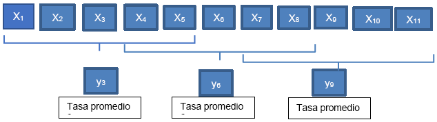 El método del promedio móvil es un cálculo matemático, que implica utilizar una ventana deslizante de 5 días continuos de datos recopilados, a partir de fuentes oficiales del Ministerio de Salud de Bolivia, para calcular el promedio departamental de casos nuevos. Es una ventana deslizante porque se avanza a medida que se agregan nuevos casos de virus SARS-CoV-2. De esta manera se ha calculado el promedio móvil central de 5 días de casos en forma dinámica. Es decir, de 5 días, se tomó el día 3 y se le suma los 2 días anteriores y los 2 días posteriores para obtener una tasa promedio móvil de 5