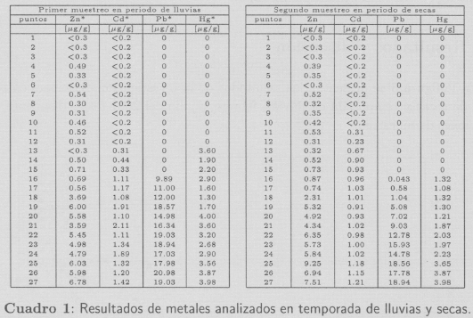 La contaminación de la zona costera de la bahía de Chetumal fue caracterizada mediante el análisis de metales en sedimentos superficiales (2 a 5 cm) en 27 puntos de muestreo a lo largo de la línea de costa de la bahía de Chetumal, Quintana Roo, realizando 2 muestreos, uno en temporada de secas en primavera y el otro en temporada de lluvias en el otoño durante 2001. Se determinó la concentración de 4 metales (Zn, Pb, Cd y Hg) en los sedimentos de la isobata de 500 m. Los metales en la temporada de secas presentan una ligera disminución en los puntos 13 al 16 comparados con los de temporada de lluvias, los niveles de Pb y Hg se mantienen altos y rebasan los valores normales de las normas oficiales Nacionales e Internacionales.