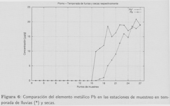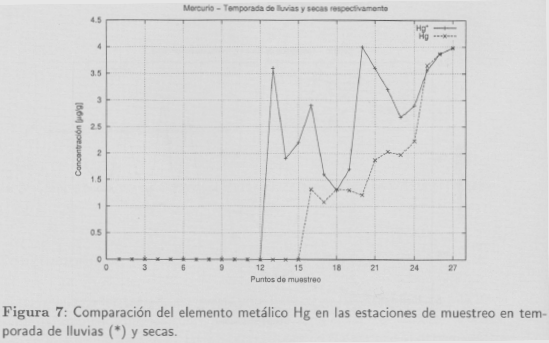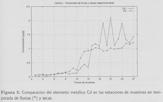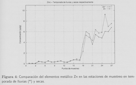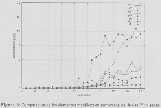 Se observó que en las temporadas secas y de lluvias, en las estaciones 13 a la 27 se incrementaron gradualmente las concentraciones de cada elemento metálico. Particularmente, de la estación 16 a la 27 las concentraciones de Hg y Pb se mantienen fuera de los niveles normales en la temporada seca. En la temporada de lluvias el Pb se eleva a partir de la estación 13 y el Hg se eleva a partir de la estación 16. Con respecto al Cd, éste tiene valores significativos en las estaciones siguientes a la estación 12 y podemos observar que los elementos metálicos se mantienen con valores elevados a partir de la estación 13 (figuras 3, 4, 5, 6 y 7). El Zinc presentó un nivel más bajo con respecto a su concentración en la temporada de lluvias, contrariamente a los demás elementos metálicos. Lo anterior significa que la región limítrofe entre la bahía y la ciudad es la zona más afectada por el impacto antropogénico, debido a las descargas de aguas residuales y por el arrastre de contaminantes agroquímicos que provienen de la zona cañera de la ribera del río Hondo (figura 1 y 2).