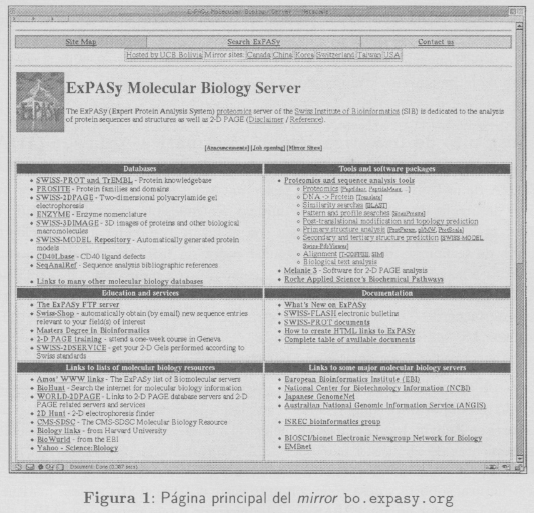 Estos objetivos han permitido al IIIA participar en un proyecto de investigación y desarrollo tan importante como ExPASy (ver figura 1), facilitando a los investigadores y educadores en Bolivia, Latinoamérica e incluso el mundo entero, el acceso a una colección de herramientas de análisis y bases de datos dedicadas a la proteómica. El hecho de tener un servidor mirror de estas características se convierte en una realidad a partir de un esfuerzo notable, puesto que para su ejecución han sido necesarios contactos, infraestructura, soporte y desarrollo conjunto entre el IIIA, el SIB y otras instituciones. Es así que el servidor mirror ExPASy es administrado íntegramente por el IIIA y forma parte de la red latinoamericana de Bioinformática para América Latina y el Caribe (LacBioNet, http://www.lacbionet.org) [4].