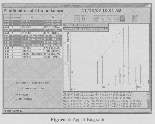 Paralelamente se han realizado desarrollos de nuevas herramientas que han sido completamente implementadas en el IIIA e incorporadas en el sitio ExPASy. Uno de los desarrollos más sobresaliente es Biograph que es una herramienta de visualización y manipulación de espectros de masa correspondientes a secuencias proteicas. El desarrollo de esta nueva herramienta fue realizado en el lenguaje JAVA bajo forma de un applet usando la tecnología Java Web Start (http://java.sun.com/products/javawebstart). Las funcionalidades de esta herramienta incluyen el análisis de espectros de masa, reportes, gestión de grupos de espectros, zooming, printing. Esta aplicación es principalmente usada por los químicos y biólogos en varias aplicaciones biotecnológicas incluyendo la búsqueda y creación de nuevos medicamentos farmacéuticos y terapéuticos. La figura 3 ilustra esta aplicación gráfica que puede ser manipulada a través de un navegador.