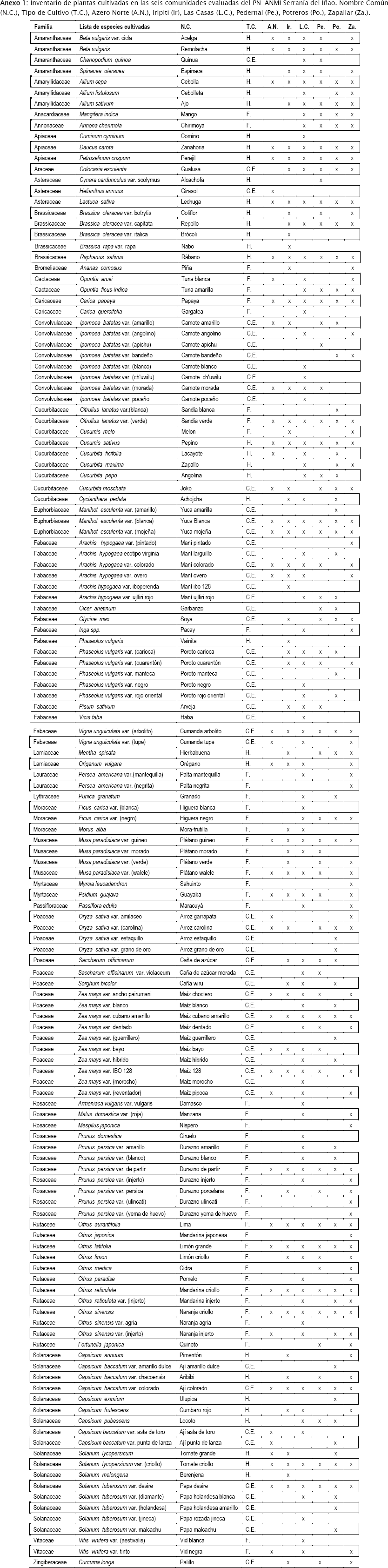 A través del inventario generado en este estudio, se tiene una idea más clara sobre qué plantas se cultivan actualmente dentro del área protegida. Debido a que existe un número mayor de plantas registradas en este estudio, comparado a los registrados por SERNAP [13] de 33 plantas cultivadas.