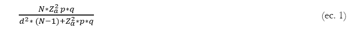 Dónde N representa el total de la población, Za2 equivale a valores tabulados de distribución normal 1,962 (95% confianza) y 1,645 (90% confianza), p es la proporción esperada (en este caso 5% = 0,05 y 1% = 0,01), q es la relación de 1 p(en este caso 1 - 0,05 = 0,95 y 1 - 0,01 = 0,99) y d es la precisión (en este caso 3%, proporción esperada). Realizando los cálculos se obtuvo que el número de familias mínimo por cada comunidad es de 10 entrevistados, por tanto, se realizaron encuestas a un total de 60 familias.