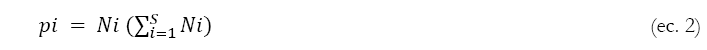 Dónde pi es la abundancia relativa de la especie i, S es el número total de especies en la comunidad, Ni corresponde al número de individuos de la especie.