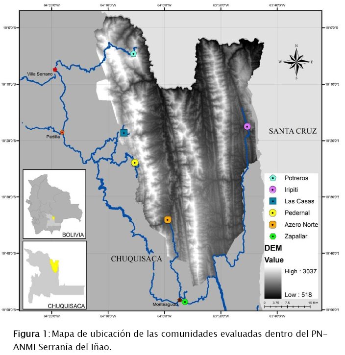 El estudio se llevó a cabo en 6 comunidades que se hallan en el área de amortiguación y dentro de los confines del PN-ANMI Serranía del Iñao (Fig. 1). Políticamente, el área protegida está ubicada al noreste del Departamento de Chuquisaca, comprende parte de los Municipios de Villa Vaca Guzmán, Monteagudo, Padilla y Villa Serrano. Geográficamente el área protegida se encuentra ubicado en las coordenadas 18°5600,82 a 19°4858,79 latitud Sur y entre 63°4200,03 a 64°1630,71 longitud Oeste, con un rango altitudinal que varía entre los 520 a 3,030 ms.n.m. El Parque Nacional tiene una superficie de 901,24 km2 y el Área Natural de Manejo Integrado 1.736,22 km2[13][20], y la superficie total es 2 637,46 km2.