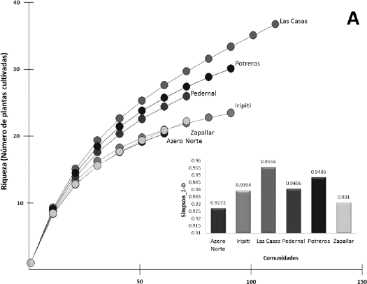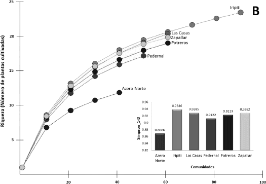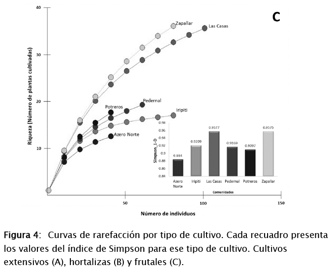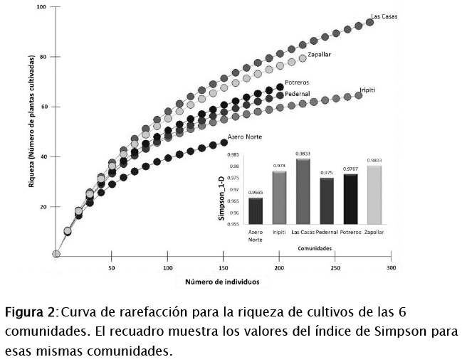 Además, se elaboraron curvas de abundancia o de rarefacción individual para estimarla riqueza esperada de las plantas cultivadas y para establecer comparaciones entre las seis comunidades evaluadas[5][6][12].