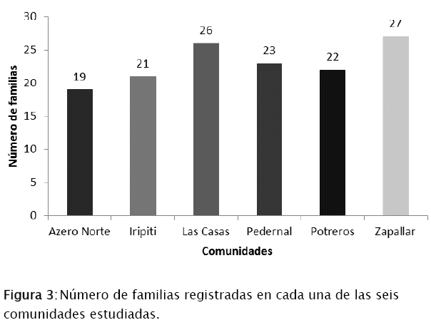 Por otra parte la comunidad Zapallar posee la mayoría de las familias registradas (27 familias), siendo Lythraceae la única familia que no se registró en esta comunidad. En Las Casas se tienen registradas 26 familias (Zingiberaceae y Bromeliaceae no han sido reportadas). De manera decreciente, las comunidades de Pedernal (23 familias), Potreros (22 familias), Iripití (21 familias) y Azero Norte (19 familias) presentan menor cantidad de familias registradas. Con base en la relación de familias compartidas, se determinó que existen familias registradas en solo dos comunidades como es el caso de las familias Lauraceae y Passifloraceae, registradas en la comunidad de Las Casas y Zapallar; la familia Lynthraceae en Las Casas y Potreros, y la familia Bromeliaceae registrada en Iripití y Zapallar (Tabla 2). De las familias que se encuentran en todas las comunidades, 10 pertenecen a cultivos extensivos, 16 a frutales y 9 corresponden a hortalizas (Fig. 3). Aunque este análisis es demasiado general, ya que dentro de las familias Fabaceae, Solanaceae, Amaranthaceae y Asteraceae están plantas cultivadas que pertenecen a cultivos extensivos y hortalizas. De la misma manera, en la familia Cucurbitaceaese hallaron frutales y hortalizas.
