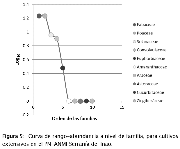 Son 59 plantas cultivadas que se han identificado para los cultivos extensivos. Según el análisis de rango abundancia, las familias Fabaceae (17 plantas cultivadas) y Poaceae (17 plantas cultivadas) tienen la mayor riqueza (Fig. 5). Esto se debe a que la familia Fabaceae con las 7 especies identificadas influyen en la riqueza, pero son sus variedades las que también aportan a la agrobiodiversidad; este es el caso del maní (Arachishypogaea con 6 variedades) y el frejol (Phaseolus vulgaris con 5 variedades). En el caso de Poaceae, se tiene al maíz (Zea mays, con 9 variedades) y el arroz (Oryza sativa, con 4 variedades). Así mismo, las familias Convolvulaceae (camote, Ipomoea batatascon 8 variedades), Solanaceae (papa, Solanumtuberosumcon 5 variedadesy ají, Capsicumbaccatum can 4 variedades) y Euphorbiaceae (3 variedades de yuca, Manihotesculenta) aportan significativamente a la riqueza de cultivos extensivos. El resto de las familias Amaranthaceae (quinua, Chenopodiumquinoa), Araceae (gualusa, Colocaciaesculenta), Asteraceae (girasol, Helianthusannuus), Cucurbitaceae (joko, Cucurbitamoschata) y Zingiberaceae(palillo, Curcuma longa) contribuyen solamente con una especie.