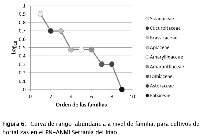 Para el cultivo de hortalizas, se han reportado 32 plantas cultivadas. Con la curva de rango abundancia se determinó que la familia Solanaceae presenta la mayor riqueza (8 plantas cultivadas), con 5 especies del género Capsicum (pimentón, Capsicumannuum; aribibi, Capsicumbaccatum var. chacoensis; ulupica, Capsicumeximium; cumbaro, Capsicumfrutescens y locoto, Capsicumpubescens) y 2 especies del género Solanum (berenjena, Solanummelongena y tomate, Solanumlycopersicum con 2 variedades). Por otra parte, las familias Cucurbitaceae (zapallo, Cucurbitamaxima; lacayote, Cucurbitaficifolia; angolina, Cucurbita pepo, además del pepino, Cucumissativus y achojcha, Cyclantherapedata) y Brassicaceae (compuesta por el rábano Raphanussativus y las variedades de Brassicaoleracea: repollo, coliflor y brócoli), presentan una mayor riqueza en segundo lugar. Existen familias con número de 3 especies identificadas, entre ellas se encuentran las siguientes familias: Apiaceae (comino, Cuminumcyminum; zanahoria, Daucus carota y perejil, Petroselinumcrispum), Amaranthaceae (acelga, Beta vulgarisvar. cicla; remolacha, Beta vulgaris y espinaca, Spinaceaoleracea) y Amaryllidaceae (cebolla, Allium cepa; cebolleta, Alliumfistulosum y ajo, Alliumsativum).