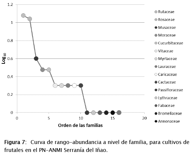 En los cultivos de frutales se tienen identificadas 49 plantas cultivadas, de entre las cuales destacan 2 familias que presentan riqueza mayores, Rutaceae (12 plantas cultivadas) y Rosaceae (11 plantas cultivadas) (Fig. 7). Rutaceae está representada por 8 especies del género Citrus (lima, Citrus aurantifolia; quinoto, Citrus japonica; limón criollo, Citrus latifolia; limón, Citrus limon; cidra, Citrus medica; pomelo, Citrus paradisi; mandarina, Citrus reticulata y naranja, Citrus sinensis) y una especie de mandarina japonesa (Fortunella japonica). Por otra parte la familia Rosaceae está compuesta por 3 especies del género Prunus como el ciruelo (Prunus domestica), damasco (Prunusarmeniaca) y durazno (Prunuspersica), esta última tiene 7 variedades registradas. Además se cuenta con el níspero (Mespilus japónica) y la manzana (Malus domestica). Otras familias registradas son Musaceae, como el plátano (Musa paradisiaca)con 4 variedades; con dos especies están Moraceae (mora, Morus alba y2 variedades de higo, Ficus carica), Cucurbitaceae (melón, Cucumismelo y dos variedades de sandía, Citrulluslanatus), Myrtaceae (guayaba, Psidiumguajava y sahuinto, Myrcialeucadendron), Cactaceae (tuna blanca, Opuntia arcei y tuna amarilla, Opuntia ficus-indica) y Caricaceae (papaya, Carica papaya y gargatea, Caricaquercifolia). Además se han identificado 8 familias que tienen una sola especie, como la familia Vitaceae con dos variedades de vid (Vitisvinifera), de la misma manera se registraron dos variedades para Lauraceae(palta, Persea americana), Passifloraceae (maracuyá, Passifloraedulis), Lynthraceae (granado, Punicagranatum), Fabaceae (pacay, Inga spp.), Bromeliaceae (piña, Ananascomosus), Anacardiaceae (mango, Mangifera indica) y Annonaceae (chirimoya, Annonacherimola) (Fig. 7).