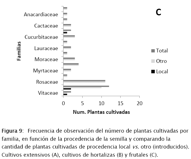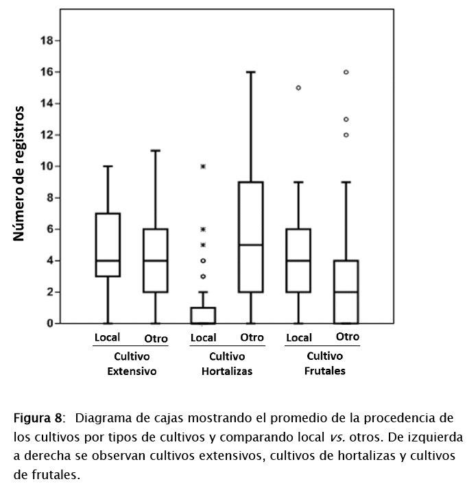 Los diferentes tipos de cultivos, se han evaluado en base a las respuestas de los agricultores sobre la procedencia de la semilla (locales vs. otros). Se hadeterminado que en cultivos extensivos existe el mismo promedio de plantas cultivadas procedentes tanto de las comunidades (locales) y procedentes de otros lugares(ūLocal=4,8; ūOtros=4,2), por lo que no existen diferencias significativas (p = 0,77). Con respecto a cultivos de hortalizas, se ha obtenido un mayor promedio de plantas cultivadas que proceden de otros lugares(ūLocal=0,9; ūOtros=5,5),estimándose que si existen diferencias significativas (p < 0,0001). Y en cultivos frutales, al contrario el promedio de plantas cultivadas que proceden de las comunidades es mayor (ūLocal=4,1; ūOtros=3,0), y se ha encontrado diferencias significativas en las evaluaciones (p=0,0006) (Fig. 8).