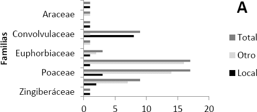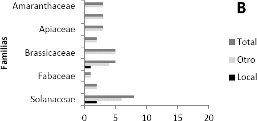 Por otra parte, se han reportado 3 familias como exclusivas de los cultivos extensivos (Poaceae, Convolvulaceae y Euphorbiaceae). Para frutales también se reportan 3 (Rutaceae, Rosaceae y Caricaceae), y 4 familias solo están presentes en cultivos de hortalizas (Brassicaceae, Apiaceae, Amaryllidaceae y Lamiaceae) (Anexo 1).