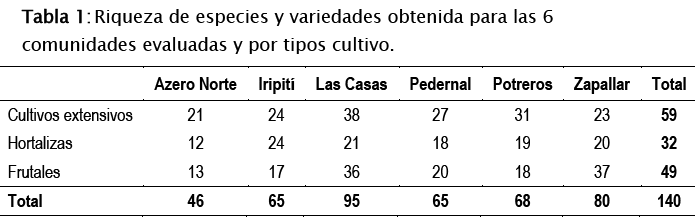 3.1 Riqueza de cultivosSe ha identificado un total de 140 plantas cultivadas en los agroecosistemas del PN-ANMI Serranía del Iñao, de los cuales 59 pertenecen a cultivos extensivos, 32 son hortalizas y 49 frutales (Tabla 1 y Anexo 1). Con respecto a la riqueza de cultivos por comunidad, se registró lo siguiente. La comunidad de Las Casas es la que presenta mayor riqueza de cultivos (95 plantas cultivadas), seguida por el Zapallar (80 plantas cultivadas). En las comunidades como Potreros, Iripití y Pedernal la riqueza de cultivos registrada no es tan baja como en la comunidad de Azero Norte la cual presenta 46 plantas cultivadas (Tabla 1).