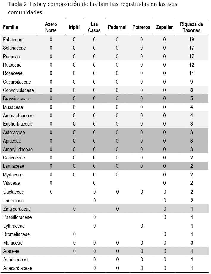 Las plantas cultivadas identificadas se encuentran agrupadas en 28 familias. De todas ellas, 16 están presentes en todas las comunidades. La familia con mayor riqueza es Fabaceae con 19 plantas cultivadas, seguida de Solanaceae y Poaceae con 17 plantas cultivadas. En cambio las otras familias varían desde 12 a 2 plantas cultivadas: Rutaceae 12, Rosaceae 11, Cucurbitaceae 9, Convolvulaceae 8, Brassicaceae 5, Musaceae y Amaranthaceae con 4, Moraceae, Euphorbiaceae, Asteraceae, Apiaceae y Amaryllidaceae con 3, y Caricaceae y Lamiaceae con 2 (Tabla 2).
