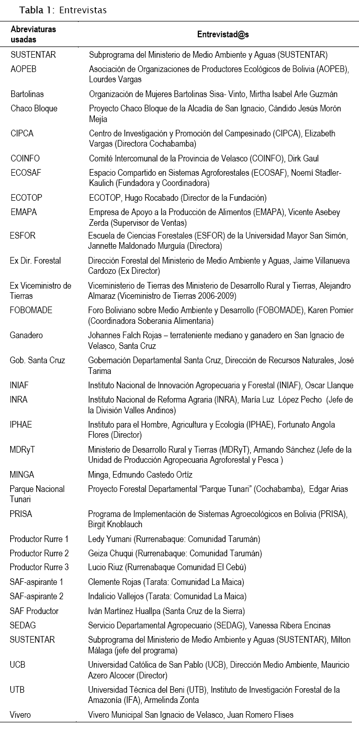 La investigación toma el ejemplo de los sistemas agroforestales (SAF) para evaluar cómo es el marco jurídico y político para un uso sostenible de la tierra en Bolivia. Este artículo resume algunos aspectos de la tesina entregada por la autora en mayo de 2013. Se basa en la elaboración descriptiva y analítica de la literatura científica, en el análisis de leyes, programas políticos, etc. y en los resultados de más de 30 entrevistas cualitativas tomadas entre agosto y noviembre de 2012 en Bolivia.